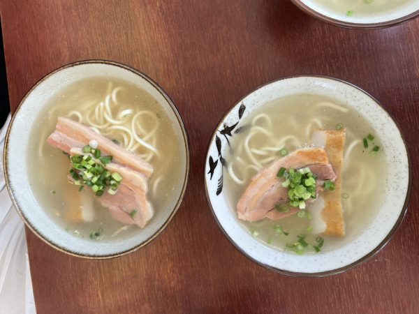 宮古そばには、三枚肉と平かまぼこがのっています。