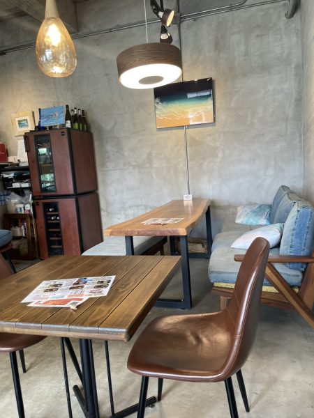 店内はコンクリート打ちっぱなしのおしゃれな空間で、ウッドテーブルや観葉植物、海をイメージしたアートが飾られていてとても落ち着きます。