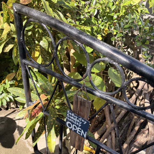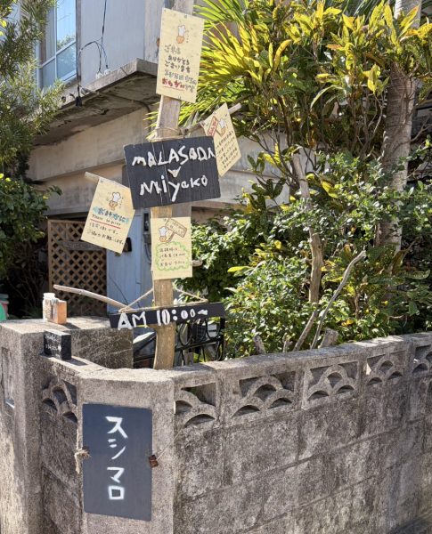 「MALASADA MIYAKO」「AM10:00〜」の案内板や、Saturday / Sunday / Monday OPENと書かれた小さなプレートがとても可愛らしく、
