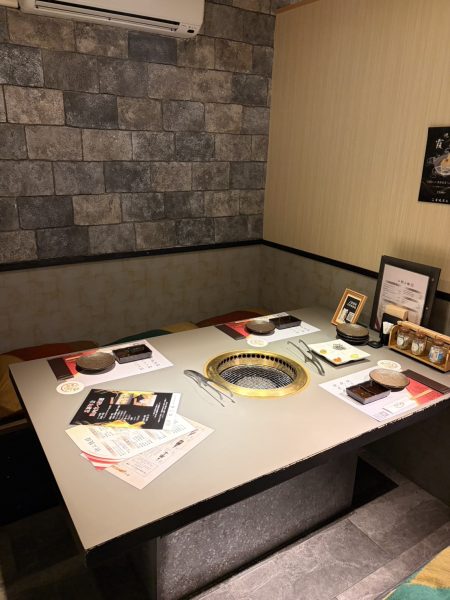 半個室のテーブル席はロールスクリーンで仕切られ、背面には和風の屏風も設置されています。